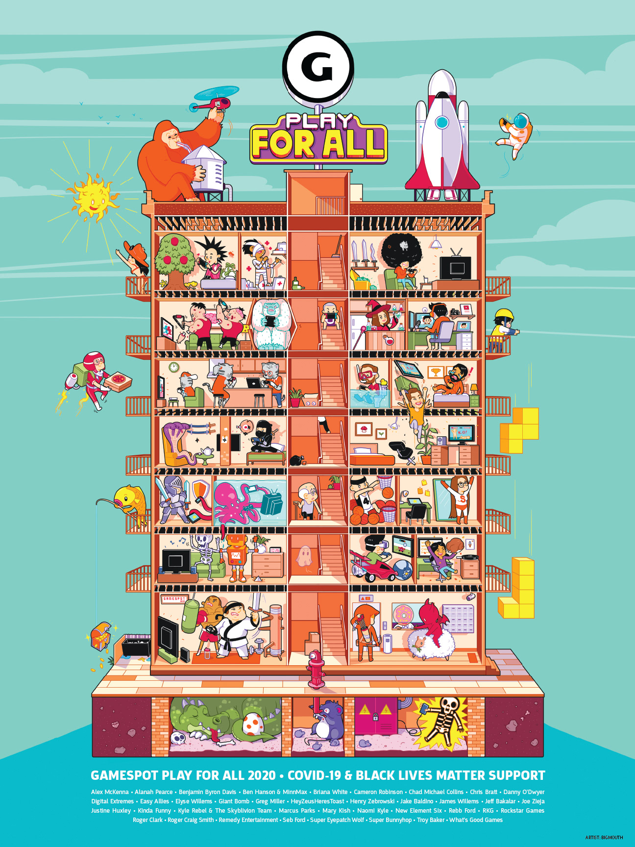 With the cancellation of E3 and a global pandemic. GameSpot wanted to connect with their audience and host their own virtual event. To show community, fun and togetherness at home the Play for All event was born. With colorful and amusing branding we came up with a hero illustration made of video game references that was weaved through out the campaign. The idea was to show all of us at home playing video games together.
